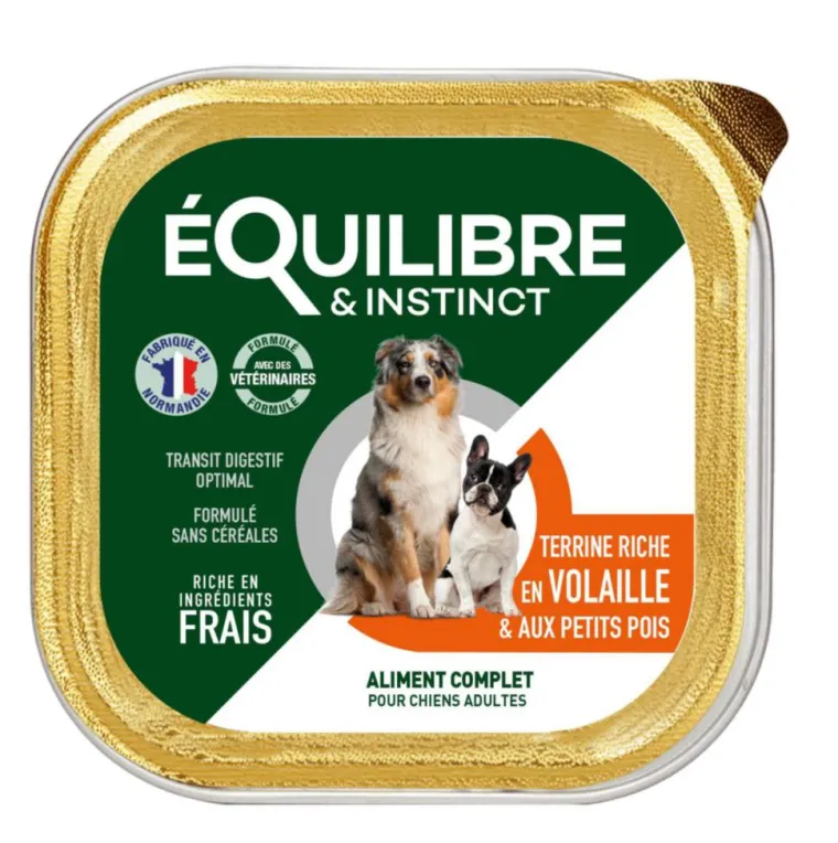 | Composition | Terrine d’ingrédients frais, riche en volaille et aux petits pois : Volaille (14% min, ingrédients frais 14% min), porc (ingrédients frais 13%), boeuf (ingrédients frais 4%), légumes (petits pois 4%), gluten de blé, farine de blé, minéraux, dextrose. Additifs Technologique: Gomme de cassia 5078 mg, Additifs Nutritionnels : Vitamine D3 152 UI, Vitamine E 87 mg, Biotine 0.016 mg, Vitamine B1 19.57 mg, Iode (E2) 0.18 mg, Manganèse (E5) 1.05 mg, Cuivre (E4) 0.08 mg, Zinc (E6) 13.89 mg.