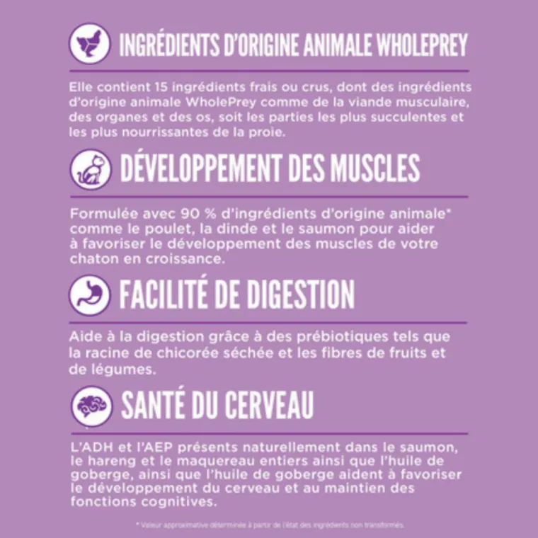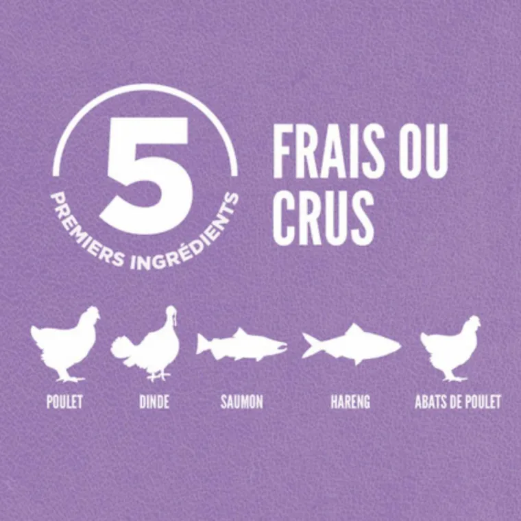 | Composition | Poulet frais (31%), dinde crue (8%), saumon cru (6%), hareng entier cru (5%), abats de poulet frais (foie, cœur) (4.5%), foie de dinde cru (4%), maquereau entier cru (4%), œufs frais (4%), poulet déshydraté (4%), dinde déshydratée (4%), hareng déshydraté (4%), foie de poulet déshydraté (4%), oeufs déshydratés (4%), lentilles rouges entières, pois entiers, huile de goberge (3%), pois chiches entiers, lentilles vertes entières, haricots Pinto entiers, haricots entiers, amidon de pois, miscanthus moulu, gras de poulet (0,5%), citrouille entière fraîche, courge musquée entière fraîche, varech séché, racine de chicorée, pommes entières fraîches, carottes entières fraîches, poires entières fraîches, courgette entière fraîche, feuilles de betteraves fraîches, chou frisé frais, épinards frais, feuilles de navet fraîches, bleuets entiers, canneberges entières, baies de Saskatoon entières, racine de bardane, lavande, racine de guimauve, chardon marie, fruits de l’églantier, curcuma.ADDITIFS (par kg) Additifs technologiques : Extrait de tocophérol issu d’huiles végétales : 121 mg, acide citrique : 40 mg. Additifs sensoriels : Extrait de romarin : 80 mg. Additifs nutritionnels : 3a890 Chlorure de choline (choline) : 500 mg, 3a370 Taurine : 400 mg, 3b606 (Zinc : 80 mg), 3b406 (Cuivre : 11 mg), 3a821 Vitamine B1 : 12,5 mg, 3a825i Vitamine B2 : 5 mg, 3a314 Vitamine B3 : 25 mg, 3a841 Vitamine B5 : 4 mg, 3a831 Vitamine B6 : 3,75 mg, 3a880 Vitamine B7 : 0,03 mg, 3a316 Vitamine B9 : 0,4 mg, Vitamine B12 : 0,05 mg, Vitamine E : 60 IU. Additifs zootechniques : 4b1707 Enterococcus faecium NCIMB 10415 1×10^9 CFU.
