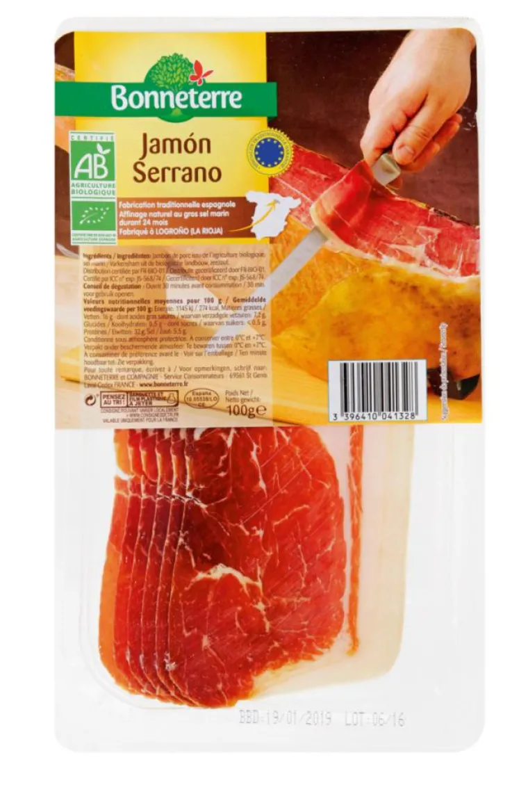 | Composition | Jambon de porc issu de l’agriculture biologique, sel marin