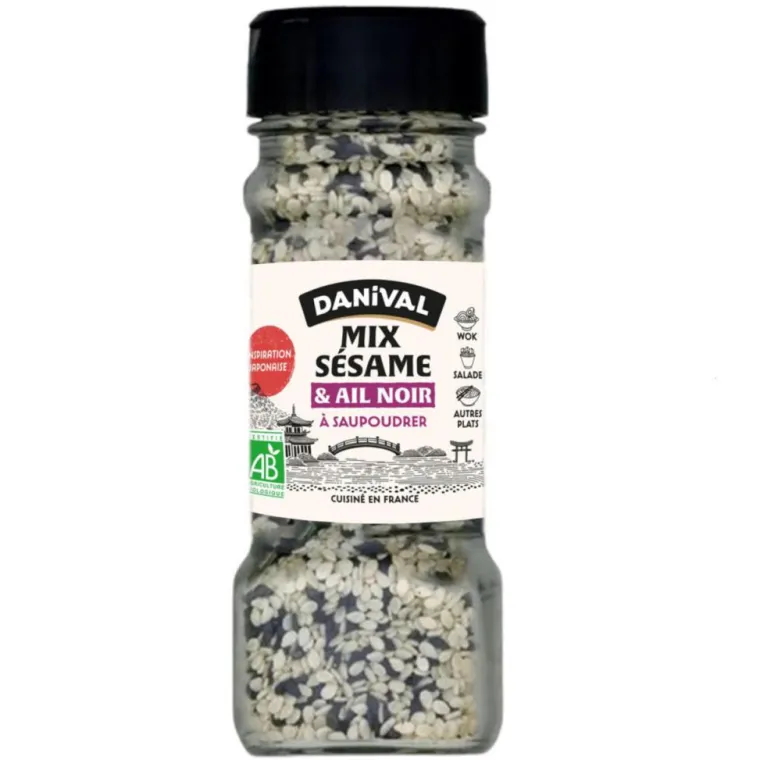 | Composition | Graines de sésame* 79%, ail noir* 5%, ail*, sel, ciboulette*, huile de tournesol*. *Ingrédients issus de l’agriculture biologique. Allergènes : Sésame Peut contenir des traces de : céleri, gluten, fruits à coque et sulfites.