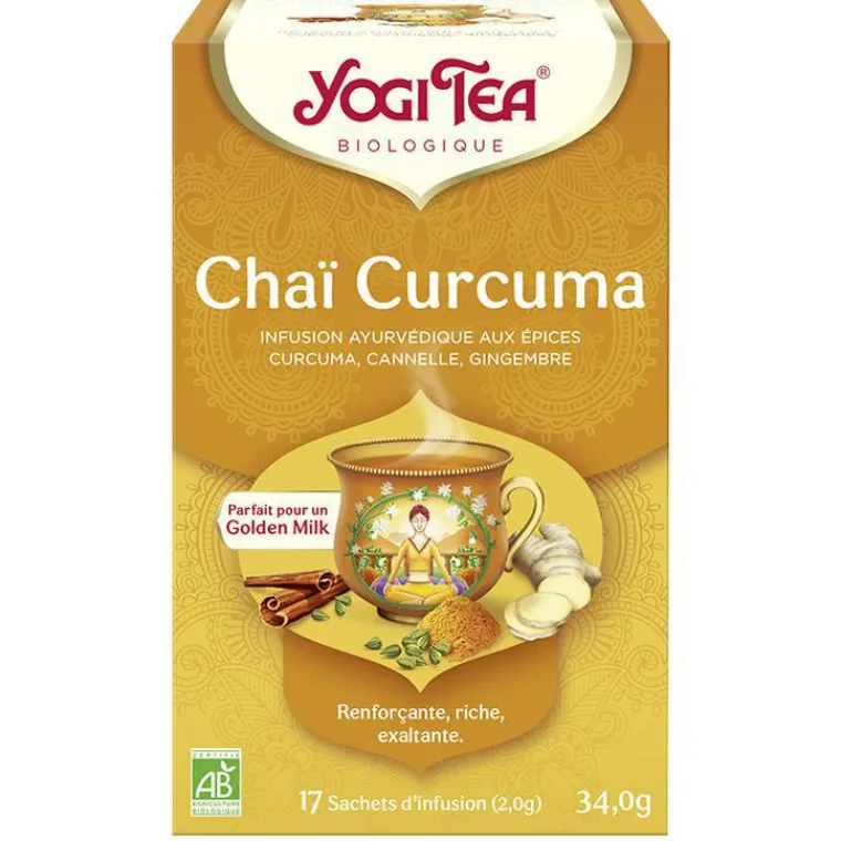 | Composition | Curcuma* (55%), cannelle* (14%), réglisse*, gingembre* (7%), cardamome* (3%), poivre noir*, pomme*, fenouil*, macis*, écorces de cacao*, clous de girofle*. *agriculture biologique