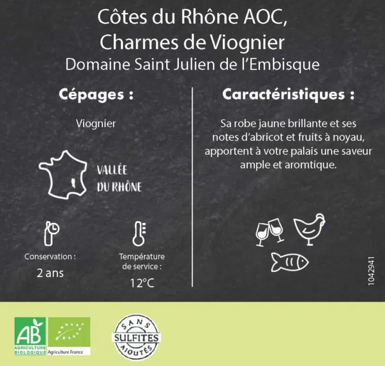 | Cépage | 98% Viognier, 2% Grenache blanc