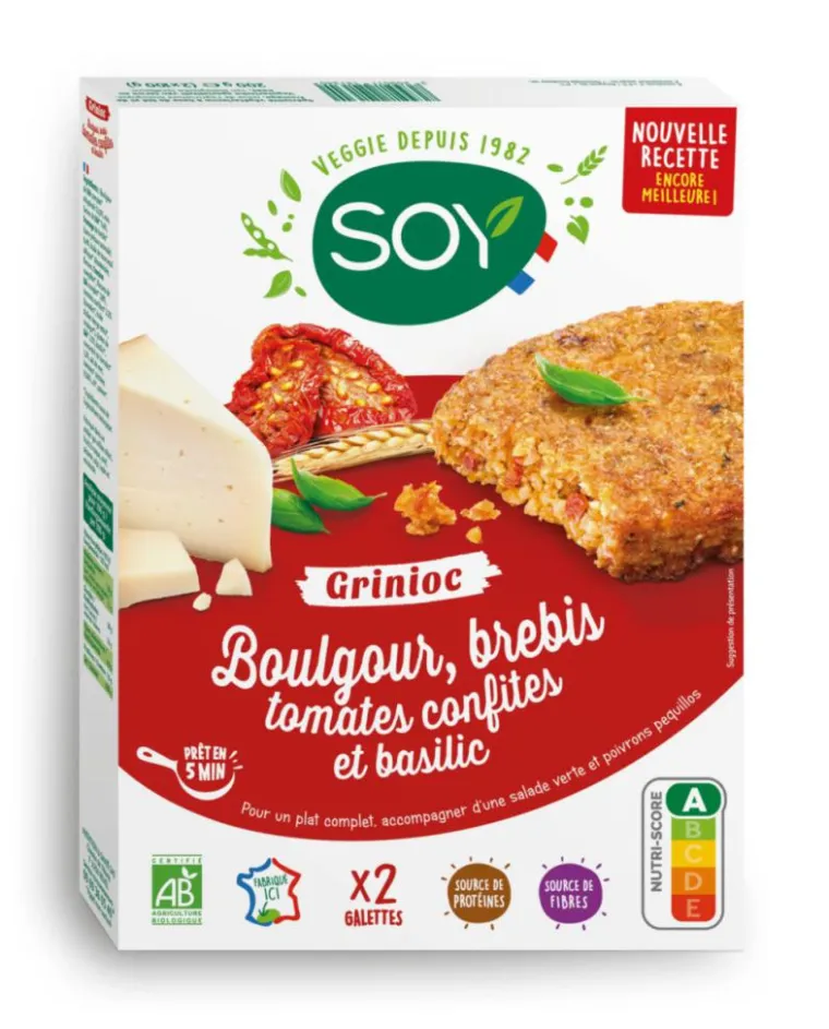 | Composition | BOULGOUR DE BLE complet* réhydraté 52,6%, eau, farine de BLE* 9,4%, FROMAGE DE BREBIS* (sans présure animale) 6,4%, huile de tournesol oléique* désodorisée, flocons d’AVOINE complète*, flocons de BLE complet* 3,8%, tomates confites 2,2% (tomates*, huile d’olive vierge extra*, vinaigre*), GLUTEN DE BLE* 2,1%, basilic*, concentré de tomates* 1,3%, sel de mer, tomates séchées* 0,56%, ail*, poivre*.