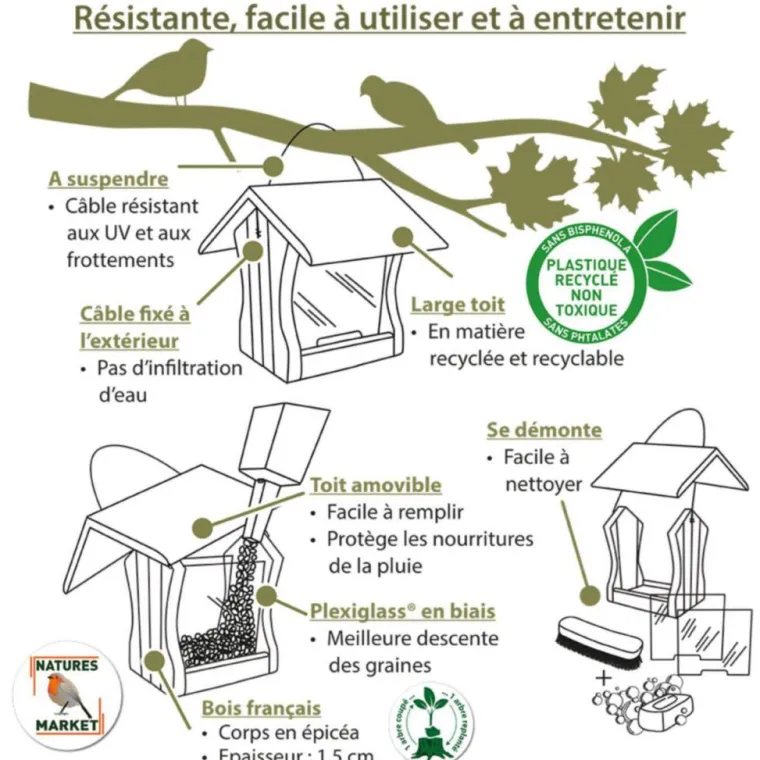 | Conseils d’entretien | Nettoyez la mangeoire toutes les deux semaines, ou plus souvent par temps humide, pour prévenir l’accumulation de moisissures ou de bactéries.Le toit coulissant permet un remplissage facile et protège les graines, mais pour un entretien optimal, il est conseillé de le nettoyer en le glissant doucement, mais vous pouvez le nettoyer à grandes eaux.Videz les graines humides ou souillées et nettoyez la partie en bois à l’eau claire.Évitez l’usage de détergents afin de préserver la sécurité des oiseaux.Un entretien simple et efficace pour garantir un refuge sain et accueillant aux oiseaux !