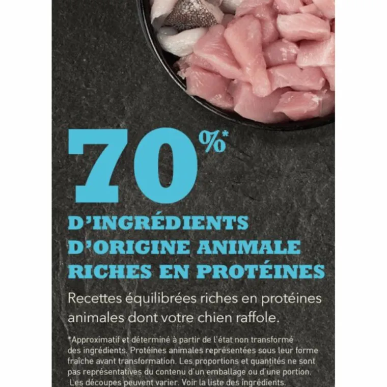 | Composition | Les chiots de petite race se développent rapidement sur une courte période et ont besoin d un régime riche en protéines et en matières grasses animales. C est pourquoi ACANA Puppy small breed comporte 70% de poulet élevé en liberté, d oeufs pondus au nid et de plie sauvage, tous convertis sous forme de bouchées parfaites pour les chiens de petite race.Poulet désossé frais (16%), poulet déshydraté (13%), dinde déshydratée (12%), lentilles roses, petits pois entiers, abats de poulet frais (foie, coeur, rognons) (7%), gras de poulet (7%),oeufs entiers frais (4%), plie entière fraîche (4%), hareng déshydraté (3%), huile de hareng (3%), luzerne séchée au soleil (2%), lentilles vertes, féveroles (2%), pois jaunes entiers, fibres de pois, cartilages de poulet frais (2%), varech, citrouille fraîche, courge musquée fraîche, panais frais, chou vert frais, épinards frais, feuilles de moutarde fraîches, feuilles de navet fraîches, carottes fraîches, pommes Red Delicious fraîches, poires Bartlett fraîches, foie de poulet lyophilisé, foie de dinde lyophilisé, canneberges entières fraîches, myrtilles entières fraîches (bleuets), racine de chicorée, curcuma, chardon Marie, bardane, lavande, racine de guimauve, fruits de l’églantier. Additifs : zinc. Conservé de façon naturelle grâce à de la vitamine E.Composition : Protéines 33 % Matières grasses 20 % Cendres brutes 7 % Fibres brutes 5 % Humidité 12 % Calcium / Phosphore 1,5 % / 1,1 % Omega-6 / Omega-3 2,7 % / 1 % ADH / AEP 0,3 % / 0,3 % Glucosamine 1400 mg/kg Chondroïtine 900 mg/kg Répartition des calories : Énergie métabolisable : 3660 kcal/kg (439 kcal par mesure de 250ml/120g) avec 32% provenant des protéines, 22% des fruits et des légumes, et 46% des matières grasses