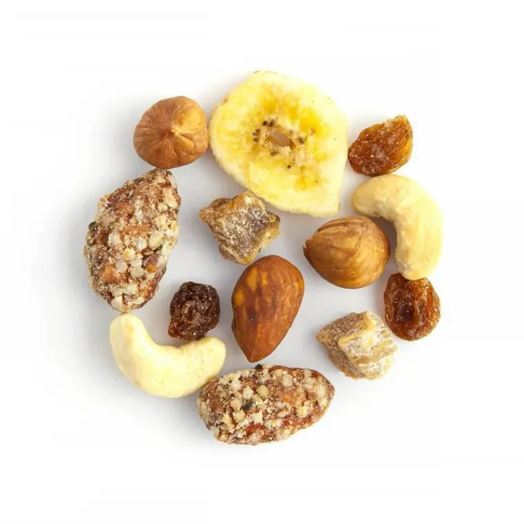 | Composition | AMANDES pralinées au chanvre* (AMANDES*, chanvre*, sucre roux*, fleur de sel), NOISETTES*, NOIX DE CAJOU*, bananes équitables*, figues* (figues*, farine de riz*), raisins*. * ingrédients issus de l’agriculture biologique