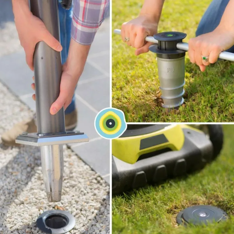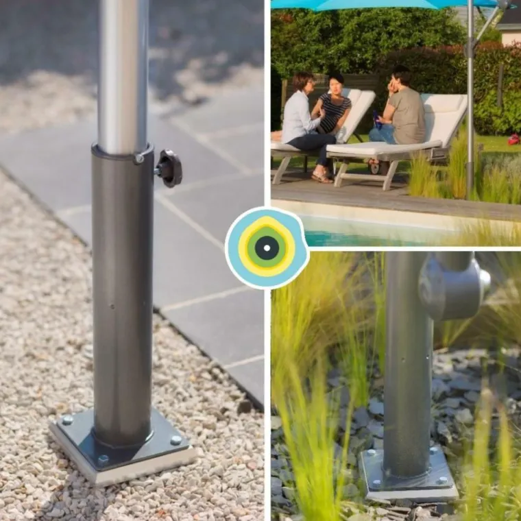 | Conseils d’entretien | Pour les petits espaces extérieurs, dans le cas notamment de maisons de ville, vous pourrez implanter une seule base d’ancrage puis ensuite alterner vos équipements. A titre d’exemple, pour venir fixer un étendoir à linge le matin, un parasol déporté l’après-midi, puis une borne solaire Gard&Rock en soirée. Le tout par un simple clipsage au sol.Afin de vérifier l’adaptabilité de votre parasol (95% des parasols sont comptabibles), il suffit de vérifier sur sa platine, l’entraxe des trous. Celui-ci doit être compris entre 55 à 133 mm (ou 77 à 188 mm pour une prise de dimension en diagonale).Dans le cas de piscine pour notamment les enfants, prenez le réflexe d’implanter une base d’ancrage juste en bordure afin de permettre l’installation facile et amovible d’un parasol déporté. Bien protégés du soleil et de la chaleur, vous-même et/ou vos petits pourront ainsi profiter de la baignade en toute sécurité En cas de sol pas assez stable et pour les plus gros parasols, nous préconisons de sceller la base d’ancrage dans du béton. Le mode opératoire est indiqué sur la notice et nous vous invitons à visualiser cette vidéo: https://bit.ly/40mV1MeDans la même gamme évolutive Gard&Rock : Base d’ancrage (428-001) / Pied pour parasol droit (428-002) / Poteaux Multisports (428-003) / Borne solaire (428-005) / Mât pour voile d’ombrage (428-011) / Poteau pour Hamac (428-014)
