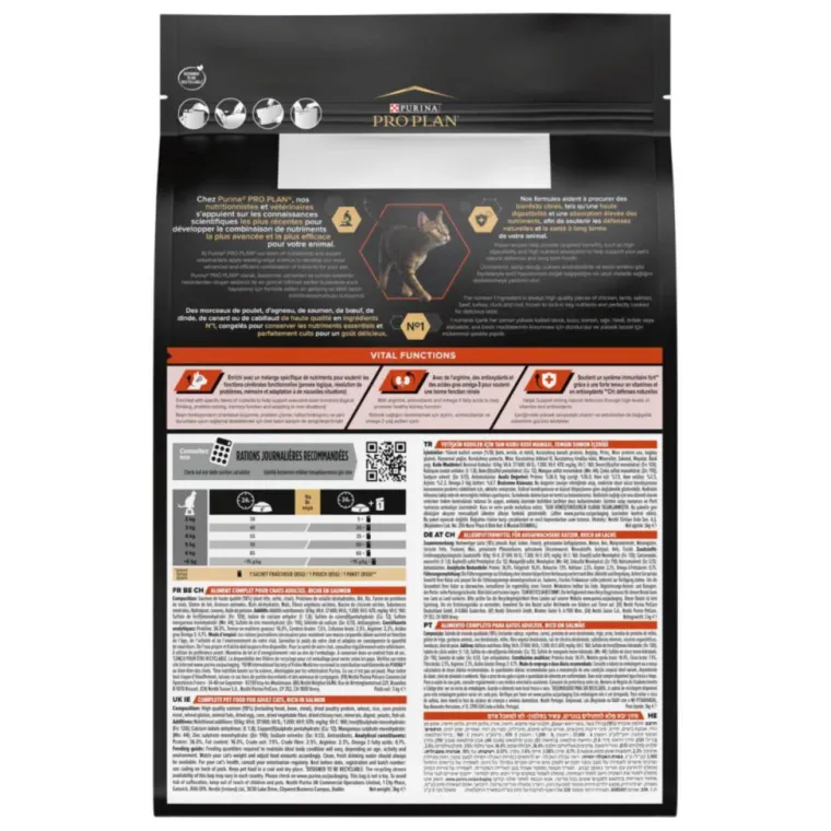 | Composition | Saumon (18 %), riz, gluten de maïs, protéines de volaille déshydratées, maïs, blé, graisse animale, œufs déshydratés, racine de chicorée déshydratée* (2 %), gluten de blé, sels minéraux, concentré de protéines de pois, hydrolysat, levures. *prébiotique naturel.