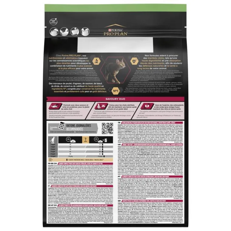 | Conseils d’entretien | Mode d’emploi: voir tableau. Les rations journalières nécessaires pour maintenir une masse corporelle idéale varient en fonction de l’âge, de l’activité et de l’environnement de votre chat. Surveillez le poids de votre chat et adaptez en conséquence la quantité de nourriture. De l’eau propre et fraîche doit toujours être disponible. Pour la santé de votre chat, consultez régulièrement votre vétérinaire.Rations journalières recommandées (g/jour) :Poids du chat Quantité 2-4 kg 25-55 g4-6 kg 55-80 g6-8 kg 80-110 g