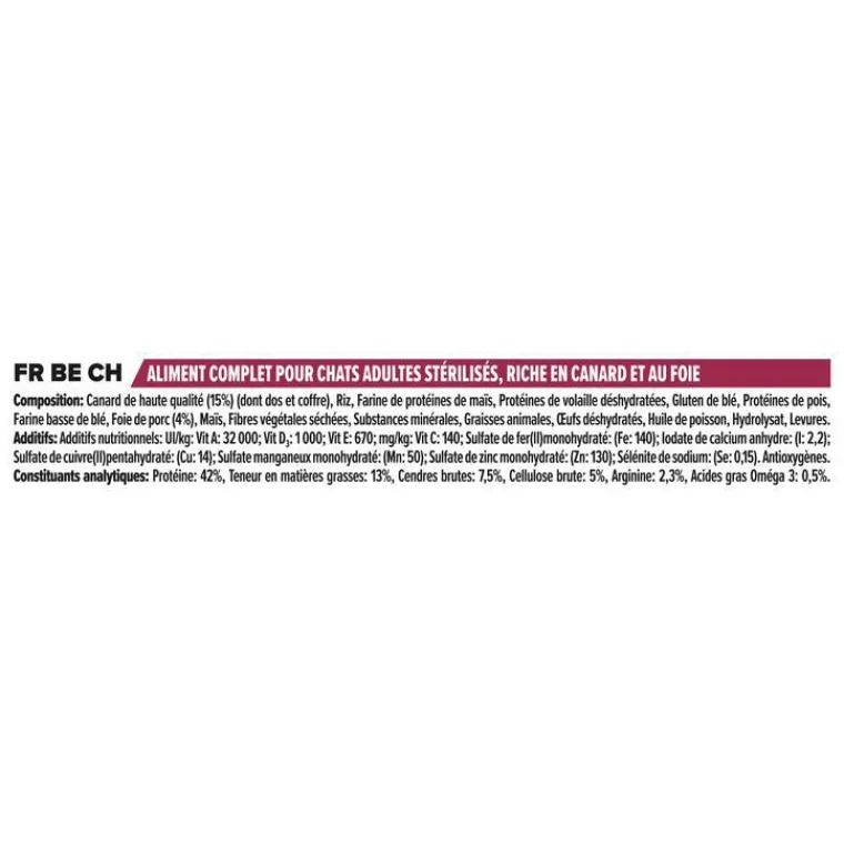 | Composition | Canard (14%), Riz, Gluten de maïs, Protéines de volaille déshydratées, Gluten de blé, Concentré de protéines de pois, Farine basse de blé, Foie (4%), Maïs, Cellulose, Substances minérales, Graisse animale, Œufs déshydratés, Huile de poisson, Hydrolysat, Levures.
