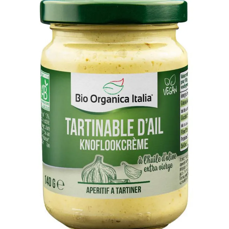 | Composition | Ail* 83%, huile extra vierge* 10%, pommes de terre*, sel, vinaigre de vin*, régulateur d’acidité : acide citrique, poudre d’ail*. * Biologique