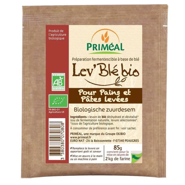 | Conseils d’entretien | Voici le secret d’une mise en oeuvre réussie :A la main: mélanger 500 g de farine + 8 g de sel + 21 g de lev’blé bio (= 2cas bombées) + environ 350ml d’eau tiède (environ 28°C). Pétrir pendant une dizaine de minutes pour obtenir une pâte souple mais non collante. Laisser reposer 30 minutes dans un saladier couvert d’un torchon humide. Reprendre le pâton en chassant légèrement l’air qui est entré pour former votre pain. Recouvrir de nouveau la pâte et la laisser poursuivre sa fermentation dans une pièce à 20°C pendant 3 heures et mettre au four chaud (220 -230 °C) pendant 45 minutes environ. En machine à pain : verser les ingrédients dans la cuve et suivre le programme pain complet (choisir le programme le plus long)