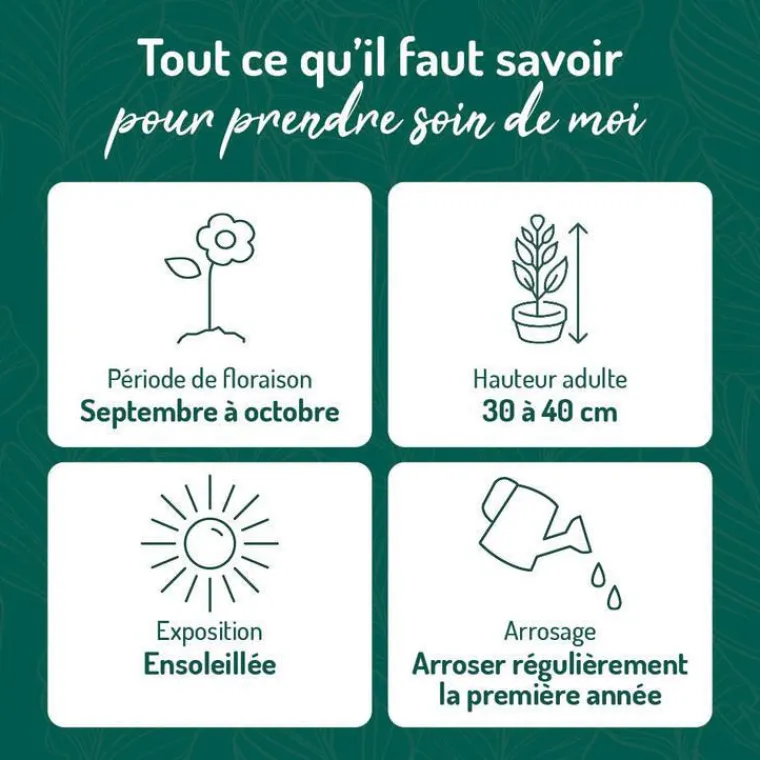 | Période de floraison | SEPTEMBRE – OCTOBRE