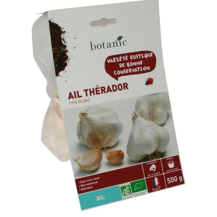 | Conseils d’entretien | ne se conserve pas en magasin après Dec… Plantez de préférence les caïeux (petits bulbes secondaires) à l’automne (Oct.-Nov.) si votre sol est bien drainé, sinon, attendez le début du printemps.Pour les régions aux climat assez doux vous pourrez même commencer à planter vos caïeux dès Jan.-Fév..Choisissez les caïeux se trouvant sur l’extérieur plutôt que ceux de l’intérieur car ils sont plus charnus et vous garantirons une meilleur levée.Plantez en ligne en espaçant chaque sillon d’une vingtaine de centimètres.Disposez chaque caïeu à quelques centimètres de profondeur, la pointe (germe) vers le haut.Espacez les caïeux de 10 centimètres environ pour leur laisser la place de se développer.Recouvrez ensuite d’une terre légère puis arrosez régulièrement.L’ail a besoin de beaucoup de soleil.L’ail n’aime pas les sols trop humides, si tel est le cas, mélangez votre terre avec du sableAvant de récolter l’ail, pensez à nouer les tiges qui commencent à jaunir de manière à stopper leur développement et favoriser la concentration de la sève dans la tête d’ail.Avant de stocker l’ail, faites le sécher quelques jours au soleil.Ensuite, nettoyez-le et conservez-le dans un endroit sec, aéré et plutôt frais.