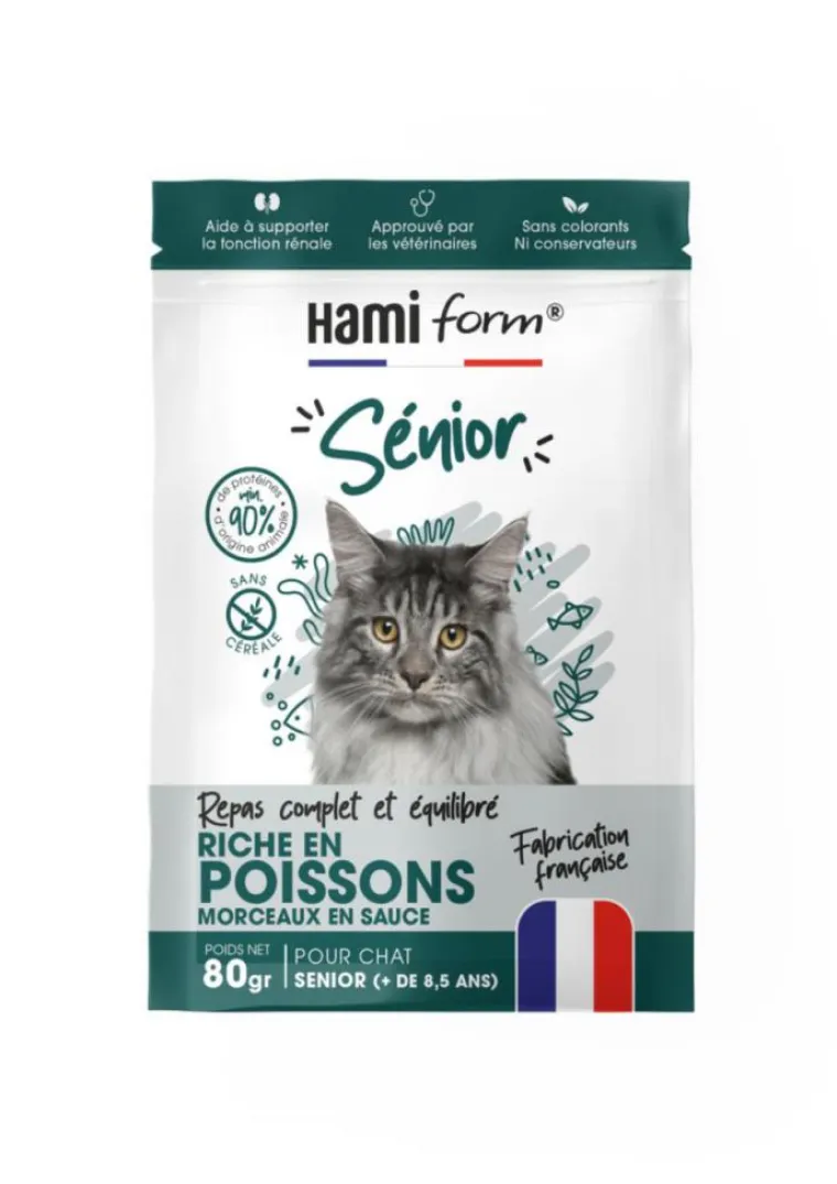 | Composition | Poissons (dont thon 20%min, truite), cuisses de poulet, fibres végétales, levure de bière, huile de saumon, épinards, petits pois, carottes, fumet de poisson, algues brunes (Ascophyllum nodosum), sel.Protéines brutes : 10,5%, Matières grasses brutes : 3,5%, Matières minérales brutes : 2%, Fibres brutes : 1,5%, Humidité : 81%, Calcium : 0,19% Phosphore : 0,17%.