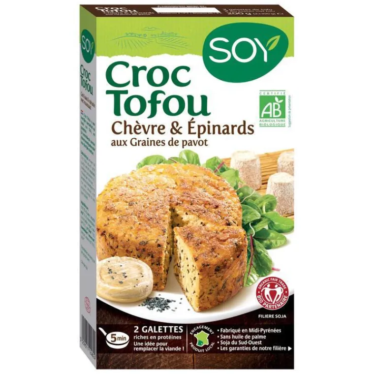 | Composition | Tofu*(1) 85,4% (eau, SOJA* décortiqué 23,1%, gélifiants : sulfate de calcium, nigari), épinards* 9,1%, FROMAGES DE CHEVRE* 7,9%, flocons d’AVOINE* complète, farine de BLE*, sel de mer, graines de pavot* 0,7%, poivre*