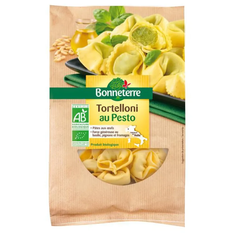 | Composition | Farine blé dur* 46%,oeuf* 9.3%, préparation basilic* 8.2%(basilic*,huile de tournesol*,sel),ricotta*8%,eau,mozarella*6.7%,mascarpone*3.1%,chapelure*(farine blé*,eau,sel),flocon PDT*,poudre lactosérum*,fromage pâte dure*1.7%,huile d’olive*vierge extra,extrait levure*,fibre psyllium*,sel,pignon pin*0.1%,conservateur:acide lactique*,ail*