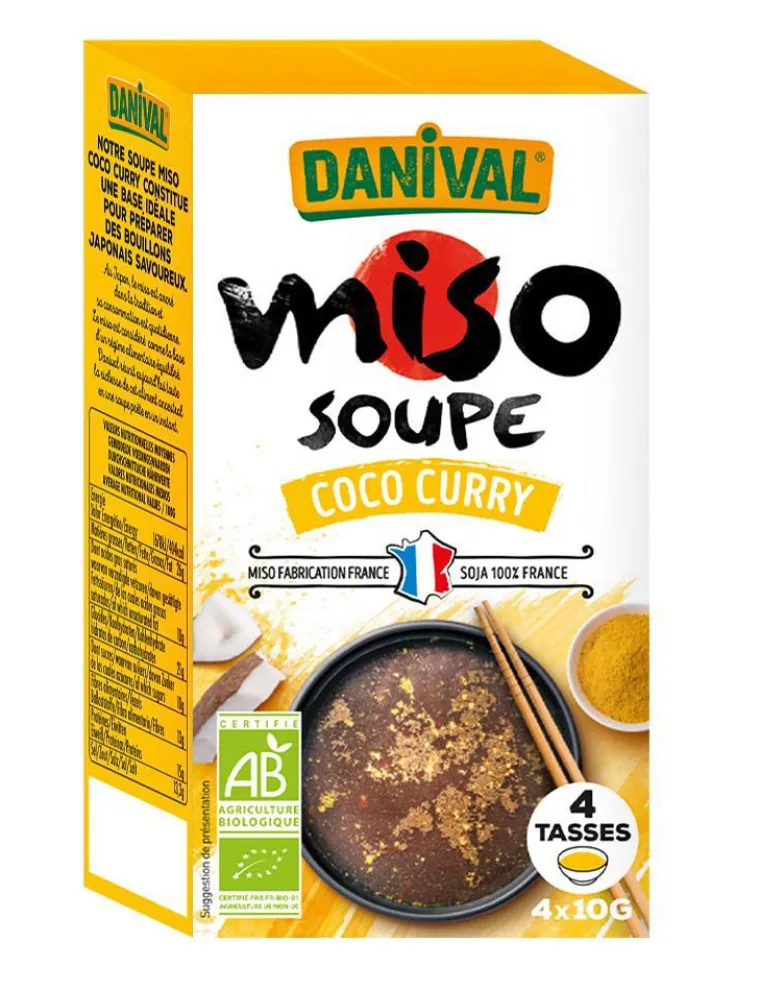 | Composition | Miso* 50% (SOJA*, riz rond semi-complet*, sel marin non raffiné de l’Atlantique, enzyme (Aspergillus Oryzae)), curry* 22,5% (coriandre*, curcuma*, gingembre*, cannelle*, poivre blanc*, fenugrec*), LAIT de coco* 15%, oignon*, sel, huile de tournesol*. *Ingrédients biologiques