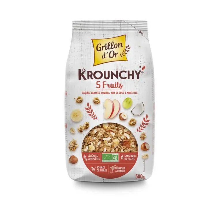 | Composition | Flocons d’avoine complets* 47%, raisins séchés (raisins* 11%, huile de tournesol*), sucre de canne*, huile de tournesol*, billettes de céréales* (riz*, blé complet*, avoine complète* 0,3%, sucre de canne*, sel), chips de bananes* (bananes* 3,3%, huile de noix de coco*, sucre de canne*), sirop de riz*, pommes séchées hachées* 4%, noix de coco séchée* 3%, graines de courge*, farine de blé*, noisettes grillées* 2%, sirop de malt d’orge*.* Ingrédients issus de l’Agriculture Biologique.
