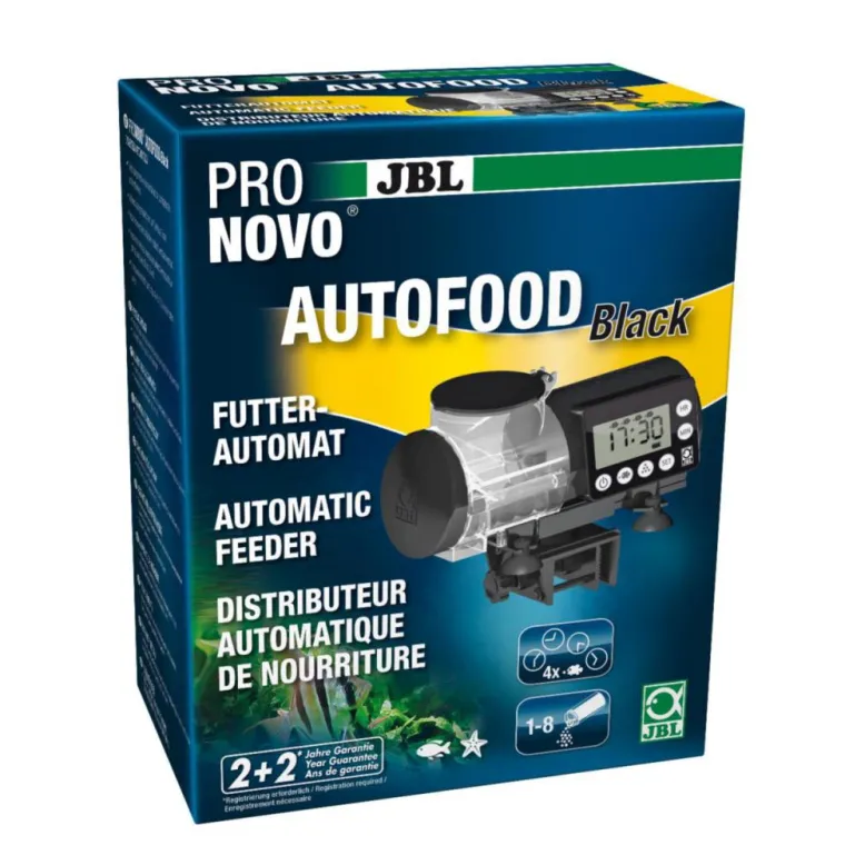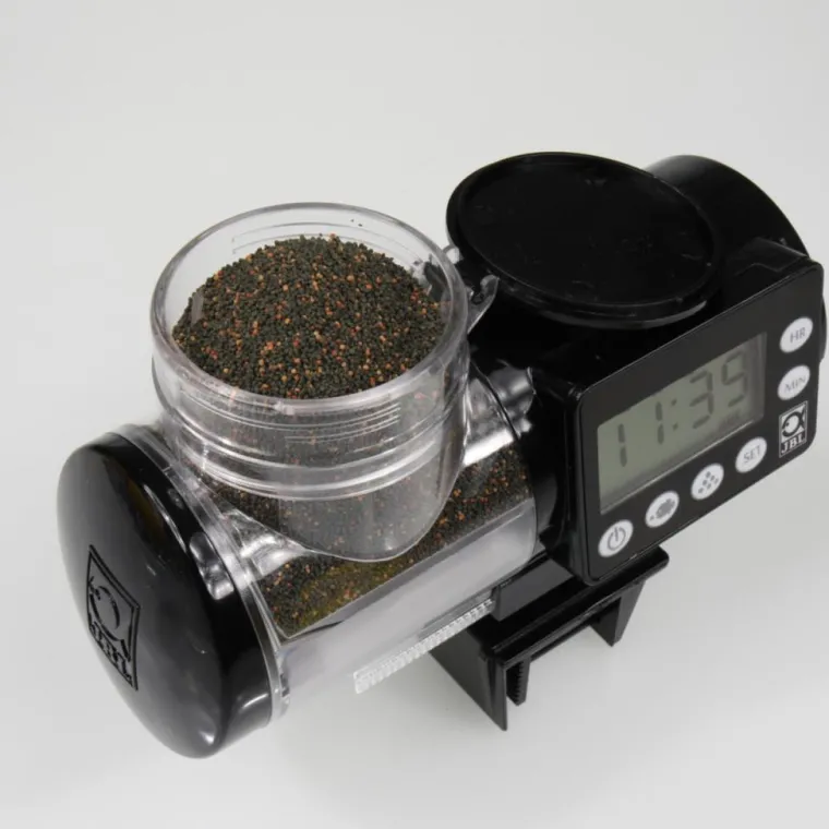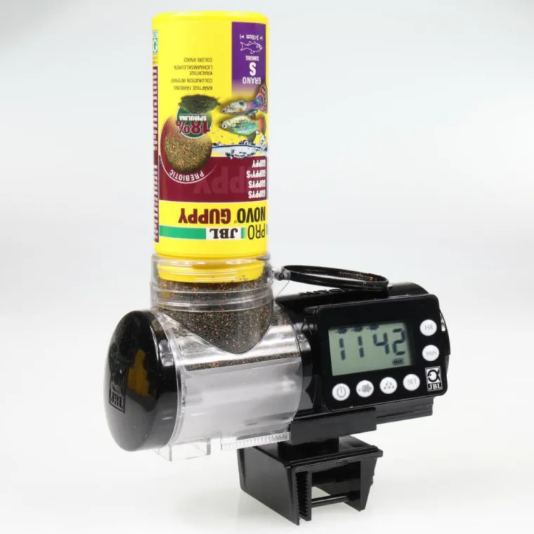 | Conseils d’entretien | Prise d’air pour séchage de la nourriture, fixation universelle par ventouses ou par support à vis de serrage (rotation à 360° sur le support). Contenu : distributeur automatique de nourriture pour poissons d’aquarium avec supports, trois piles AA de 1,5 V et bague d’adaptation pour boîtes JBL PRONOVO de 250 ml.