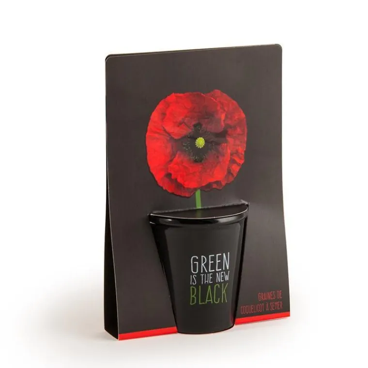 | Conseils d’entretien | Kit de semis complet pour initier la culture de Coquelicot.Constitué d’un pot de céramique de couleur noire, d’un diamètre de 6 cm, marqué au message Green is the new black, présenté dans une carte imprimée en quadrichromie, de dimensions 12 x 18 cm, mettant bien en valeur le rouge de la fleur de coquelicot.Mode de culture : A tout moment de l’année, imbiber les pastilles de terre de coco avec 5 à 6 fois leur volume d’eau claire : elles gonflent instantanément. En remplir le pot et en réserver une petite partie pour recouvrir le semis à venir. Les graines sont très fines, couper le haut du sachet et plier le bord pour faire un bec verseur. Semer quelques graines en les espaçant bien. Conserver le reste du contenu du sachet pour des semis ultérieurs. Recouvrir de restant de terre de coco, arroser en pluie fine à l’aide d’un vaporisateur à main et conserver une légère humidité à la terre pendant toute la culture. Placer le pot à 18-20 °C pour une levée rapide et homogène.Et après ? Lorsque les plants sortent de terre, les faire pousser pour qu’ils mesurent 2 à 3 cm puis en conserver seulement 2 ou 3 dans le pot. Placer en pleine lumière. Repiquer dans des godets individuels et recommencer un semis dans les mêmes conditions pour avoir plus de plants. Entre avril et septembre, (selon la date du semis initial) sortir les plants ou planter en pleine terre.
