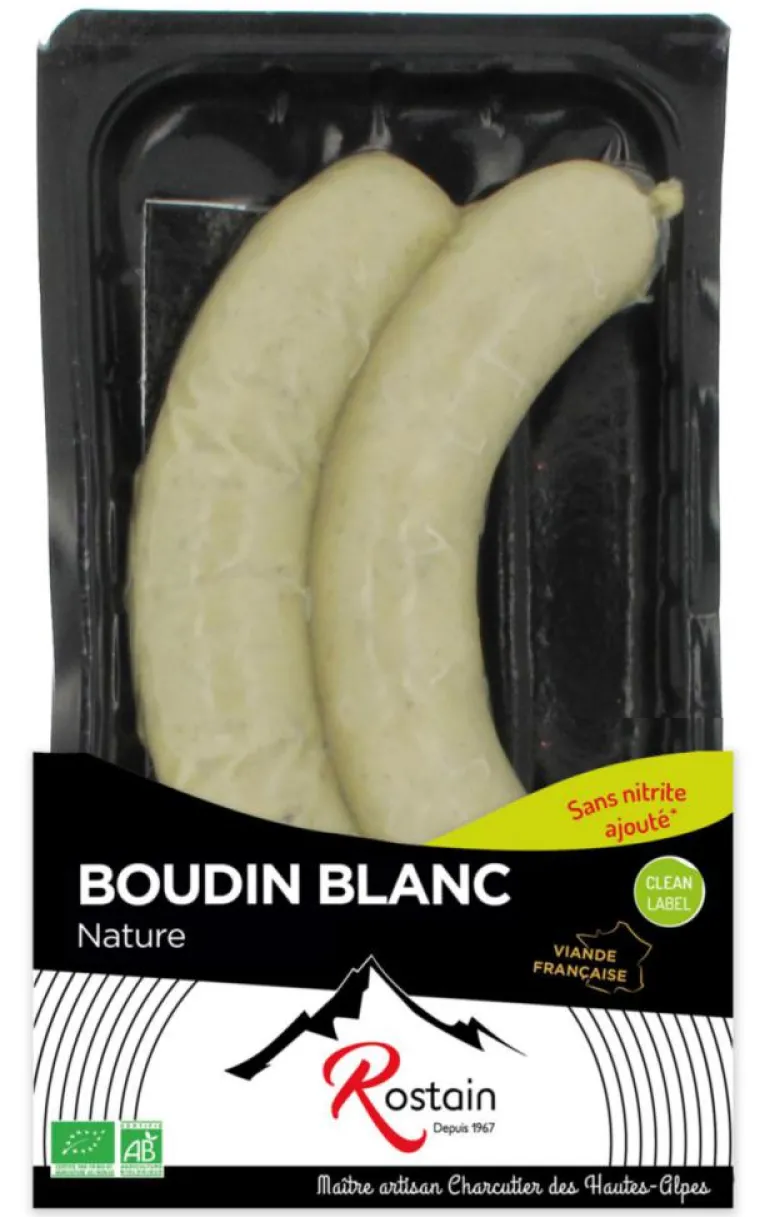 | Composition | *LAIT, *Gras de porc (15% – origine France), *Viande de volaille (14% – origine France), *Pain (farine de BLE), *Oignons, *Couenne de porc (origine France), *Viande de porc (origine France), *OEUFS, *Carottes, *Cognac (contient des sulfites), Sel de mer, *Persil, *Sucre de Canne, *Thym, *Poivre Blanc, *muscade, *girofle, *gingembre, *fenouil, *laurier, *romarin, *origan, *basilic, Boyau naturel de porc * ingrédients issus de l’agriculture biologique