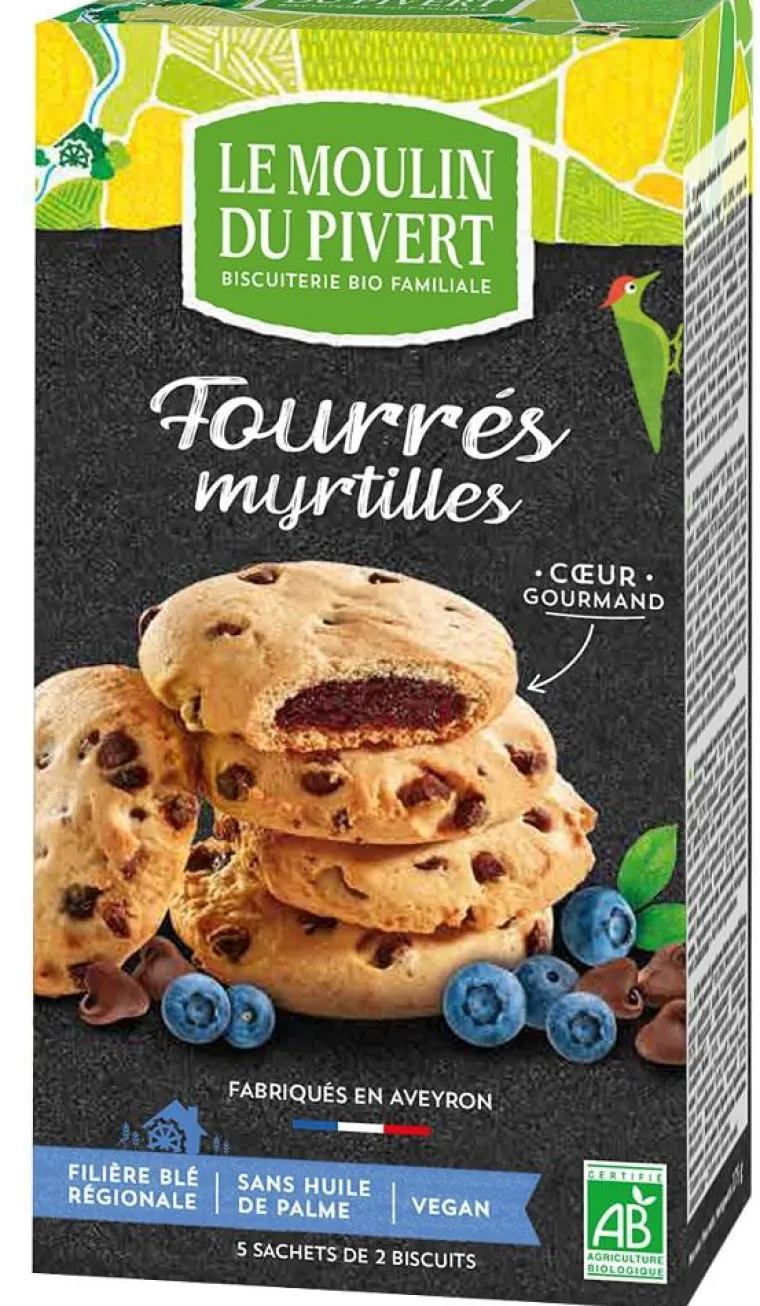 | Composition | Purée de pomme* (44,8%), farine de BLE* T65 (36,5%), sucre de canne non raffiné* (22,8%), sirop de blé*, pépites de chocolat* (9,1%) (sucre de canne*, pâte de cacao*, beurre de cacao*, extrait de vanille*), huile de tournesol* (8%), purée de myrtille* (6,9%), beurre de cacao*, NOISETTES* (2%), jus de citron concentré* (0,9%), arôme naturel*(0,35%), poudre à lever: bicarbonate de sodium.