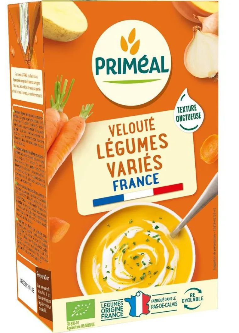 | Composition | Eau légumes 49%(légumes verts*29%(poireaux*18%,courgettes*,épinards*haricots*brocoli*)pommes de terre*13%, oignon*CELERI*) eau, onctueux AMANDE* 6% (eau, poudre AMANDES*,huile colza*)huile colza*sel cerfeuil thym*ail* *issus de l’agriculture bio