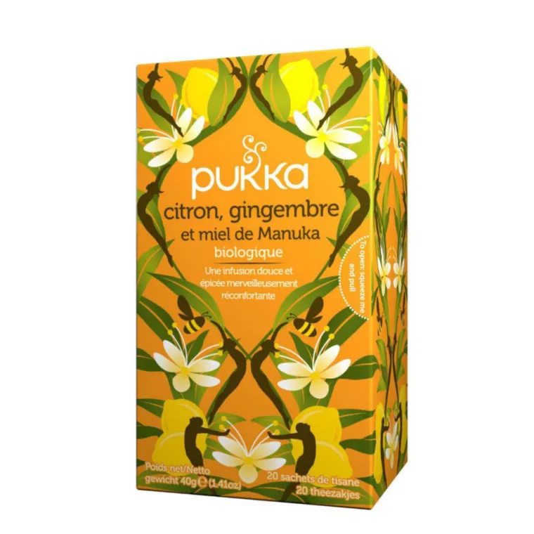 | Composition | Racine de gingembre (32%), racine de réglisse, fleur de sureau, graine de fenouil, feuille de verveine citronnelle, racine de curcuma, arôme d’huile essentielle de citron (6%), feuille de myrte citronné, citron entier (4%), arôme miel de manuka (2%).