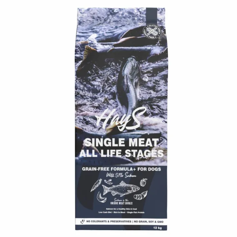 | Composition | Composition : Protéine de saumon (35 %), pois, saumon frais (14 %), patates douces, graisse de volaille, pulpe de pomme séchée, citrouille, protéine de saumon hydrolysée (2 %), carottes, kelp séché (Ascophyllum nodosum), farine de pois, glucosamine (0,026 %), sulfate de chondroïtine (0,018 %), mannaneoligosaccharides (0,015 %), extraits végétaux naturels (0,015 % – clou de girofle, romarin, curcuma et citron), fructo-oligosaccharides (0,01 %), yucca schidigera (0,01 %).