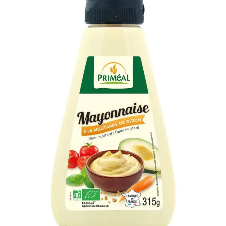 | Composition | Huile de tournesol** (70%), eau, jaunes d’OEUFS*, vinaigre de cidre**, MOUTARDE* de Dijon 6% (eau, graines de MOUTARDE*, vinaigre de cidre**, sel), sel, épaississants : gomme de xanthane et gomme de guar, jus de citron* concentré. *issus de l’agriculture biologique ** issus de l’agriculture biologique et origine France (84,8% des ingrédients agricoles bio)