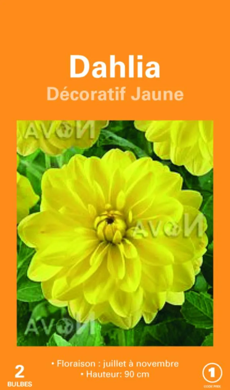 | Conseils d’entretien | Choisissez un emplacement ensoleillé dans un sol riche et bien drainé. Les bulbes de dahlias se plantent après les fortes gelées. Dans un sol ameubli, placez un tuteur au centre d’une cuvette de Ø 40 cm puis le bulbe et recouvrez-le de 5 cm de terre. Dès que la végétation s’étoffe, arrosez de préférence au pied sans mouiller le feuillage, le soir pour éviter l’évaporation. Dès le début de l’été, surveillez l’apparition de ravageurs. Arrosez copieusement à la plantation puis régulièrement pendant la végétation avec une solution d’engrais, sans mouiller le feuillage. A l’apparition des jeunes plantules, protégez des limaces et escargots. Pour des plantes plus trapues et florifères, pincez-les en début de végétation : coupez l’extrémité de la tige dès l’apparition de la quatrième feuille. Éliminez les fleurs fanées pour prolonger la floraison. Dès les premières gelées, arrachez les tubercules et remplacez-les par des bulbes à floraison printanière : tulipes, narcisses, crocus… Pailler votre sol pour le protéger et limiter le développement d’adventices. La date de floraison et hauteur varient selon le sol, l’exposition et le climat.