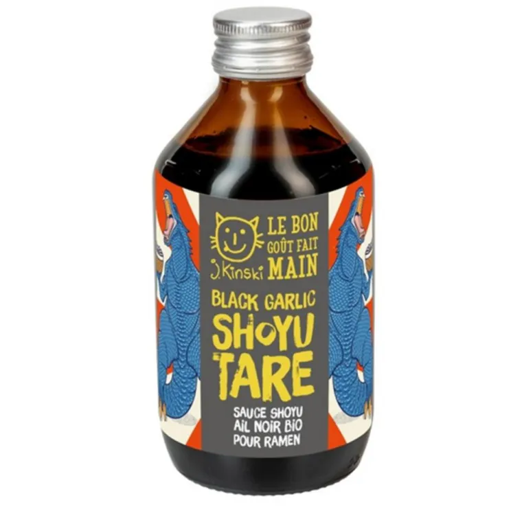 | Composition | Huile de tournesol*, sauce soja shoyu* (fèves de SOJA*, eau de BLÉ*, sel), huile de SÉSAME*, sucre de betterave*, 1% ail noir, piment*, shiitake*. * Ingrédient issu de l’Agriculture Biologique. Allergènes : Gluten, Sésame, Soja, Blé