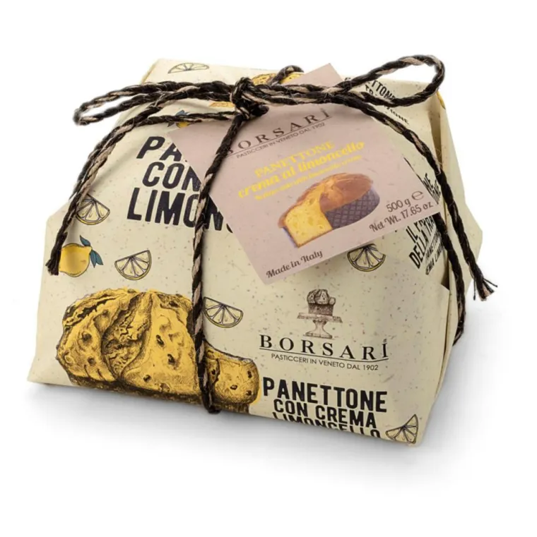 | Composition | PANETTONE FARCI AVEC CRÈME AU LIMONCELLO, AVEC ÉCORCES DE CITRON CONFITES, SANS RAISINS SECS. PRODUIT DE FOUR À LÉVAGE NATUREL. Ingrédients: farine deblé, crème de fourrage 14% [sucre, sirop de glucose,laitentier, limoncello liqueur 10% (eau, sucre, alcool, infusion de citrons 10%), eau, arômes naturels, gélifiant: pectine], écorces de citron confites en cubes et en pâte 12% (écorces de citron, sirop de glucose – fructose, sucre, correcteur d’acidité: acide citrique), sucre,beurre, jaune d’oeufs* frais, eau, levain naturel (farine deblé, eau),laitentieren poudre réhydraté, émulsifiants: Mono- et diglycérides d’acides gras; sirop de glucose, arômes naturels, sel. Peut contenirfruits à coque,sojaet moutarde. *oeufs d’èlevage au sol