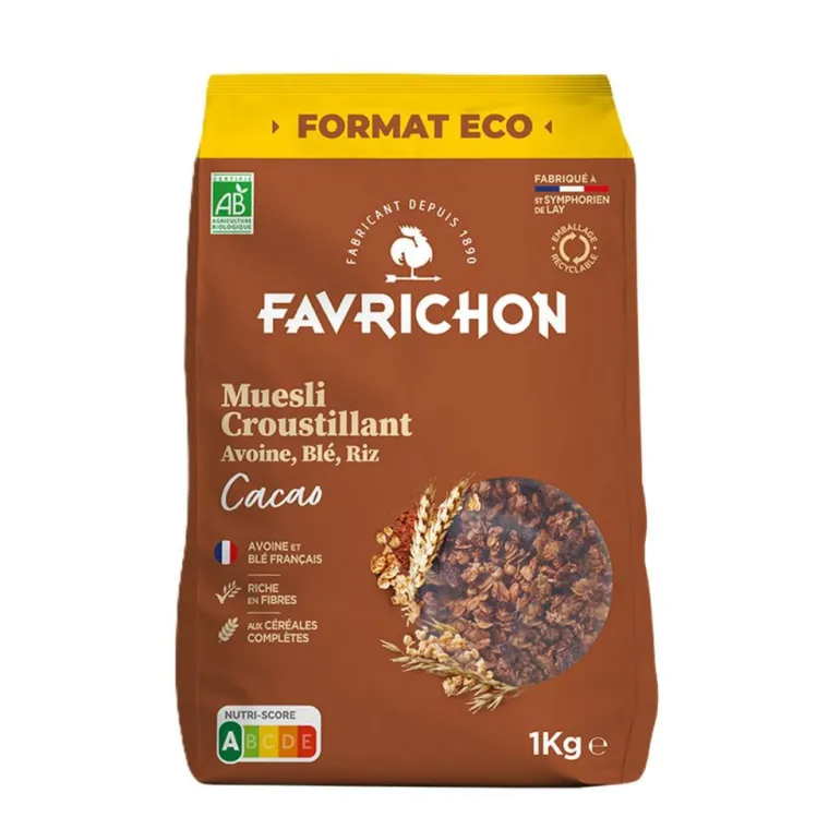 | Composition | Céréales* complètes 72,9% (AVOINE *, BLE *, riz*), sucre de canne * non raffiné, huile de tournesol*, cacao * maigre en poudre