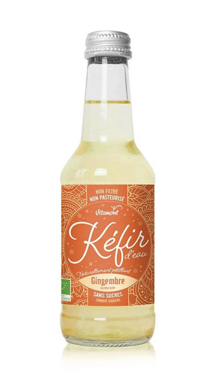 | Composition | eau, jus de gingembre frais* (2,7%), sucre de canne* (disparaît lors de la fermentation), grains de kéfir*, jus de citron jaune*, citron entier frais*, jus de figue*, poudre de gingembre déshydratée* (0,02%).
